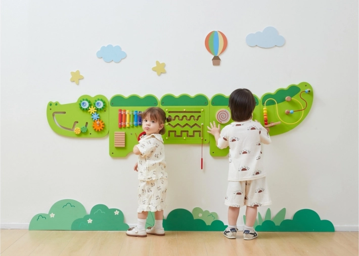 Elk paneel biedt een andere activiteit – van spelen op de xylofoon, via het draaien van tandwielen en schijven met patronen, tot het leiden van kralen en het verschuiven van onderdelen in doolhoven. Kinderen oefenen spelenderwijs coördinatie, greep, geduld en probleemoplossend vermogen. Wandmontage bespaart ruimte en maakt gelijktijdig spelen door meerdere kinderen mogelijk.