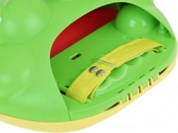 - Aan de zijkant van de katapult zit een witte rits – schuif deze om de kikkerbek te openen en het balletje in te brengen.