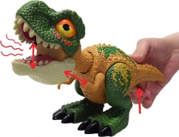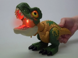 Haal de majestueuze rover Tyrannosaurus Rex in huis, die je kinderen zal verrassen met geluids- en lichteffecten. Deze realistische figuur is een perfecte keuze voor alle kleine paleontologen. Door op de staart te drukken activeer je de effecten: de kop beweegt naar voren en de bek opent met een realistische brul, terwijl er intens rood licht uit de bek schijnt voor extra sfeer.