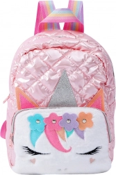 Het model is gemaakt van licht maar duurzaam materiaal dat bestand is tegen vuil en beschadiging. De voorkant is versierd met een vilten applicatie van een eenhoorn, bloemen met oortjes en een glinsterende hoorn. De rugzak heeft een ruime hoofdvak, een kleiner binnenvak en een buitenvak met rits voor eenvoudig ordenen. Verstelbare schouderbanden zorgen voor comfort en aanpassing aan de lengte van het kind.