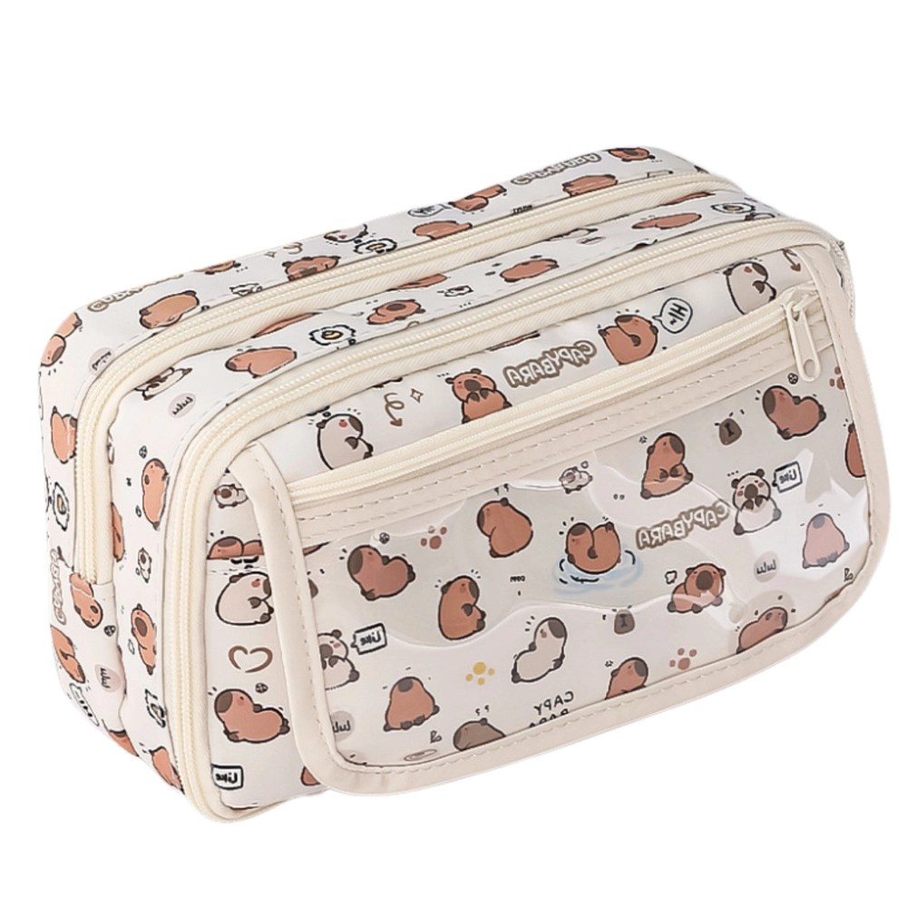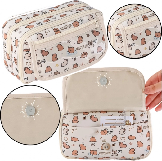 Groot en functioneel pennenetui met capibara-motief, ideaal voor leerlingen die waarde hechten aan praktische bruikbaarheid en een schattig design. In een crèmekleur met een print van sympathieke capibara’s springt dit etui eruit tussen andere schoolspullen. Geschikt voor school, hogeschool, tekenlessen of het thuiskantoor.