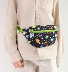 Deze donkerblauwe heuptas met ruimteprint brengt niet alleen plezier, maar voegt ook veel functionaliteit toe. Met een ruime voorvakken voor portemonnee en mobiele telefoon en een achtervak met rits voor kleine waardevolle spullen is deze heuptas ideaal voor dagelijkse avonturen.