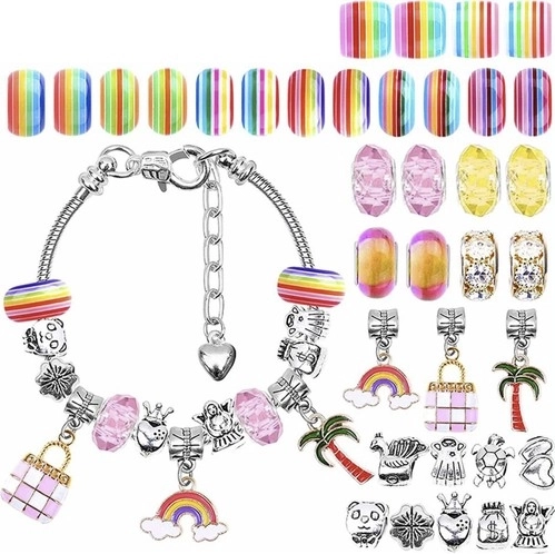 Creatieve set voor het maken van sieraden en armbanden voor kinderen biedt veel kleurrijke kralen en hangers in verschillende vormen, waarmee mooie armbanden en kettingen kunnen worden gemaakt.