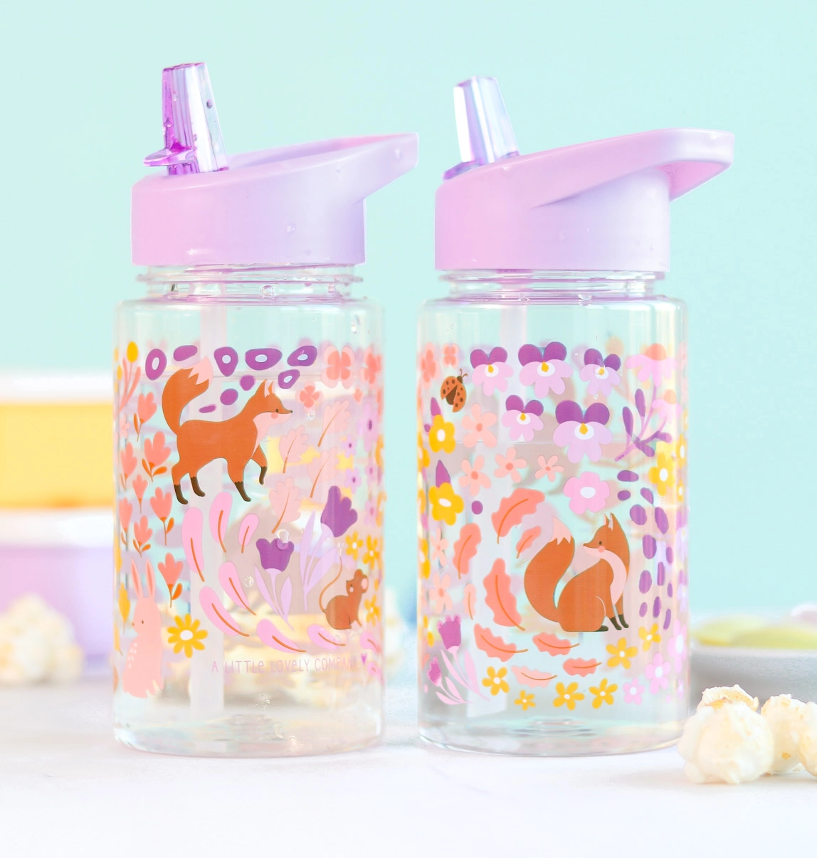 Deze transparante kinderdrinkfles is perfect voor dagelijks gebruik. Met de mooie print van dieren in een bloementuin zal hij elk kind blij maken en tegelijk het geheel versterken als set die je kunt samenstellen – drinkfles, rugzak en broodtrommel.