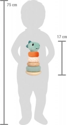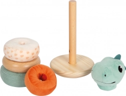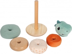 Deze motorische speelgoedtoren in de vorm van een wiebelende toren met vier kleurrijke ringen is ideaal voor het herkennen van groottes en kleuren. De toren heeft een veilige, beweegbare middenstang en een glimlachend dinokopje. De afgeronde basis zorgt voor stabiliteit, terwijl de afwisselende stoffen en houten ringen intrigeren met hun design.