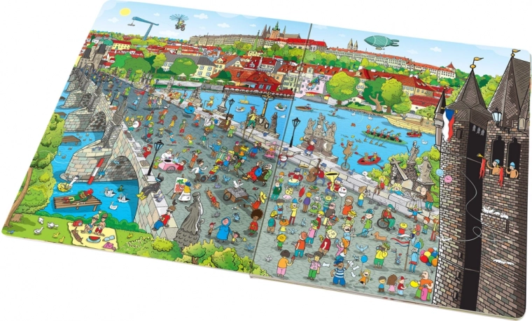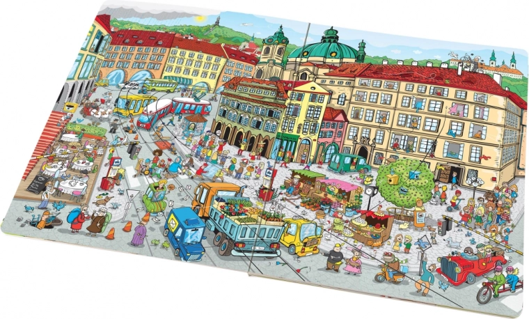 Groot prentenboek Praag vol illustraties van belangrijke plekken stimuleert pre-leesvaardigheden bij kinderen.