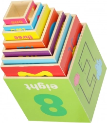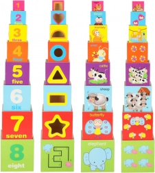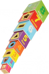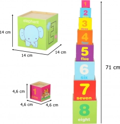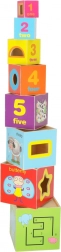 Deze set bevat 8 gekleurde houten blokken die op elkaar gestapeld kunnen worden tot een toren van wel 71 cm hoog! Elk blok heeft 8 actieve educatieve zijden en biedt diverse speel- en leermogelijkheden.