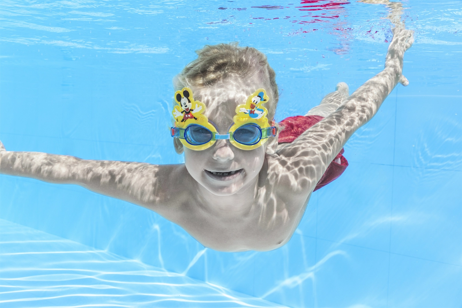 Bestway® Disney® Zwembril met Mickey Mouse & Donald Duck design is de ideale metgezel voor kleine waterratten. Getinte, schokbestendige polycarbonaat lenzen met UV-bescherming beschermen de gevoelige ogen van kinderen, terwijl siliconen oogkussens voor comfortabel dragen zorgen.