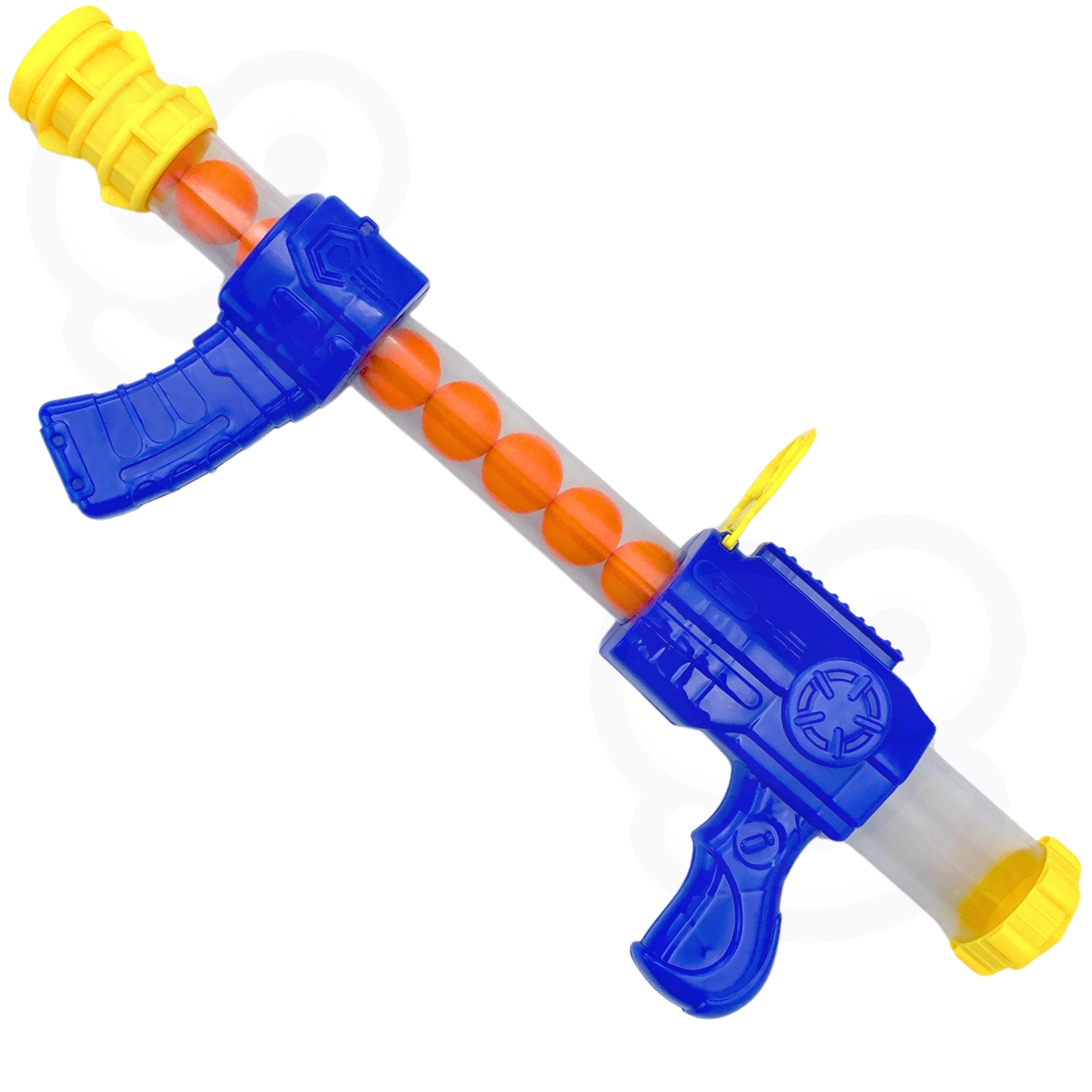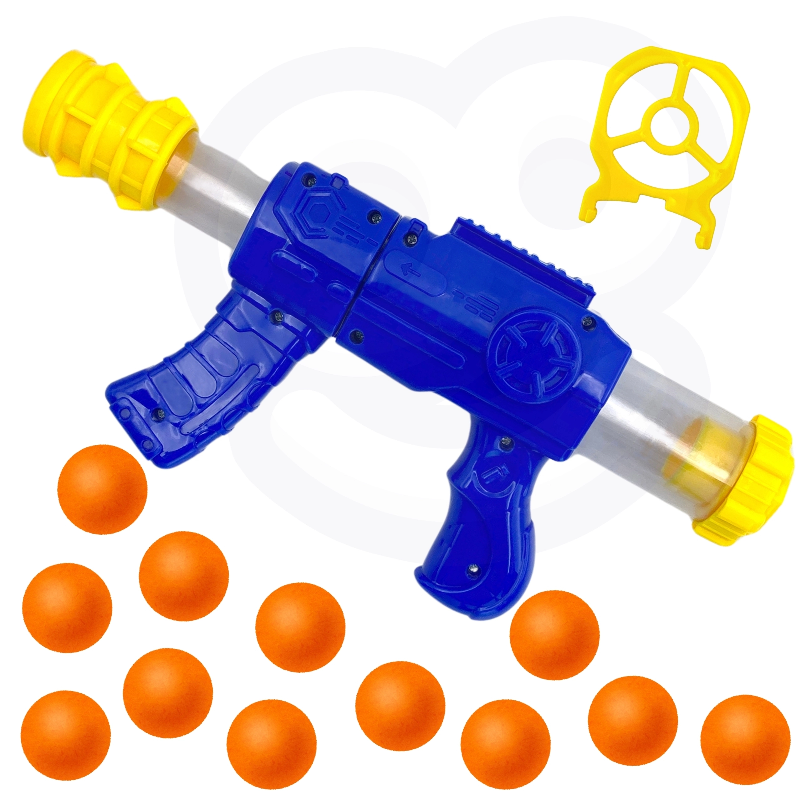 - - De pistool wordt door lucht aangedreven; duw de kolf naar je toe en het balletje wordt afgevuurd