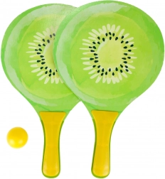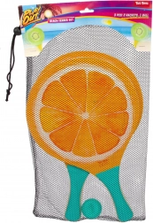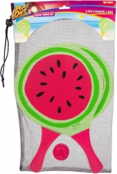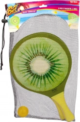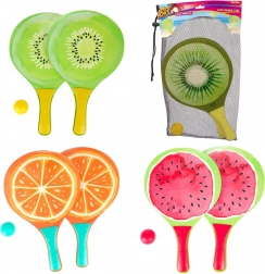 Geniet volop van de zomer met een stijlvolle strandtennisset met fruitmotieven. Bevat 2 lichte rackets en 1 bal in een praktische netzak voor transport. Kleurrijke prints van kiwi, watermeloen of sinaasappel nodigen uit om te spelen op het strand, in de tuin of in het park. Perfect voor gezinsplezier, het ontwikkelen van coördinatie en beweging in de buitenlucht.