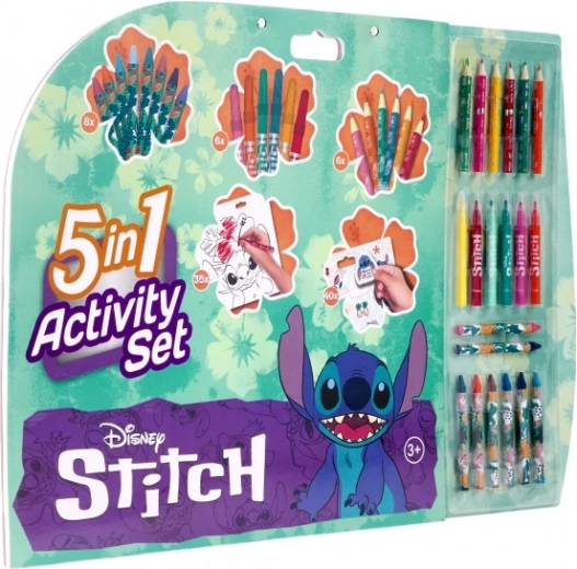 De 5-in-1 tekenset met Stitch-thema biedt alles voor een kleine kunstenaar in één set. Met deze uitgebreide set kan elk kind zich onderdompelen in de wereld van tekenen en schilderen met het geliefde personage Stitch. Bevat 6 stiften, 6 kleurpotloden, 6 waskrijtjes, 58 stickers, 15 sjablonen en 35 kleurplaten voor maximale creativiteit.