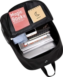 Elegante zwarte rugzak van duurzaam Oxford-textiel is waterbestendig en draagt dankzij het gewatteerde rugpand en de met MESH-netstof gevoerde schouderbanden de hele dag comfortabel. De lichtgevende, reflecterende print vergroot je zichtbaarheid in schemer en donker, ideaal voor scholieren, in de stad en op uitstapjes.