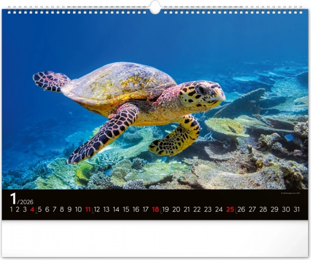 De openingspagina van de kalender neemt je mee onder het oppervlak naar een prachtige zeeschildpad die langs koraalriffen glijdt. Deze foto is een bewijs van de perfectie van de oceaanwereld.
