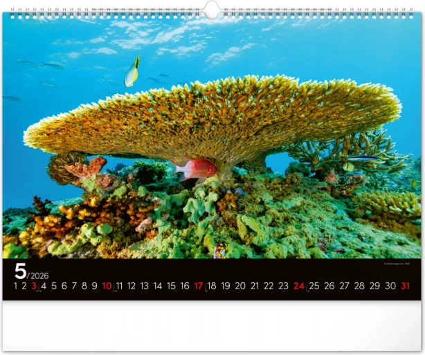 Mei brengt een beeld van een koraalparadijs met bontgekleurde vissen, die de kalender heldere en levendige kleuren geven. Deze maand straalt optimisme en schoonheid uit.