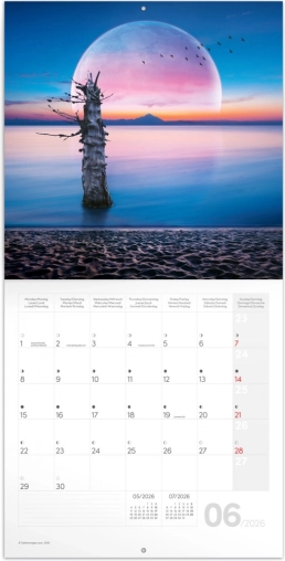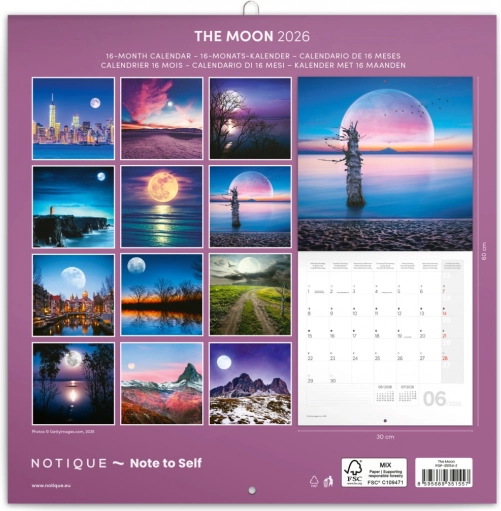 De kalender bevat een overzichtelijk kalendarium van september 2025 tot en met december 2026 met aangeduide feestdagen en maanfasen.