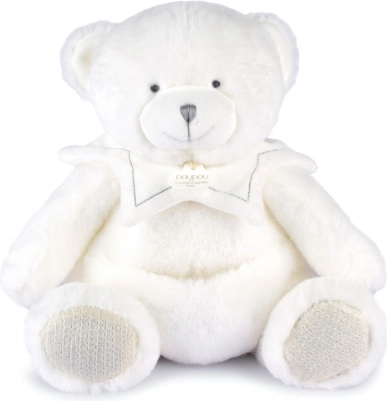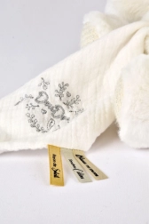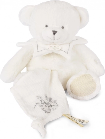 De teddybeer is voorzien van een dekentje dat je eenvoudig in zijn buikje kunt opbergen, wat zeer praktisch is tijdens reizen of bij het opruimen. Doudou is versierd met fijn borduurwerk en satijnen linten met Franse opschriften, die elk knuffelmoment extra zachtheid geven.