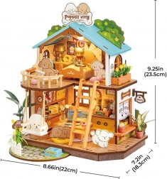 Ontdek de charme van creëren met een huisje dat een ruime slaapkamer bevat, een gezellige woonkamer met schommel en eethoek, en op de eerste verdieping een balkon. Elk detail is nauwkeurig uitgesneden en omvat zacht beddengoed, een nachtkastje met lamp, laptop, boekenkast, cappuccinautomaatautomaat en bloemen. Dankzij de LED-verlichting op de begane grond en de eerste verdieping voelt je huisdier zich prettig.