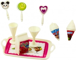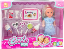 De set bevat een pop van 12 cm hoog, gekleed in een blauwe jurk met schattige prints en thematische accessoires zoals lolly’s, ijsjes, hoorntjes en een dienblad met snacks. Deze accessoires maken het spel niet alleen afwisselender, maar stimuleren ook de ontwikkeling van de verbeelding, fijne motoriek en sociale vaardigheden van het kind.