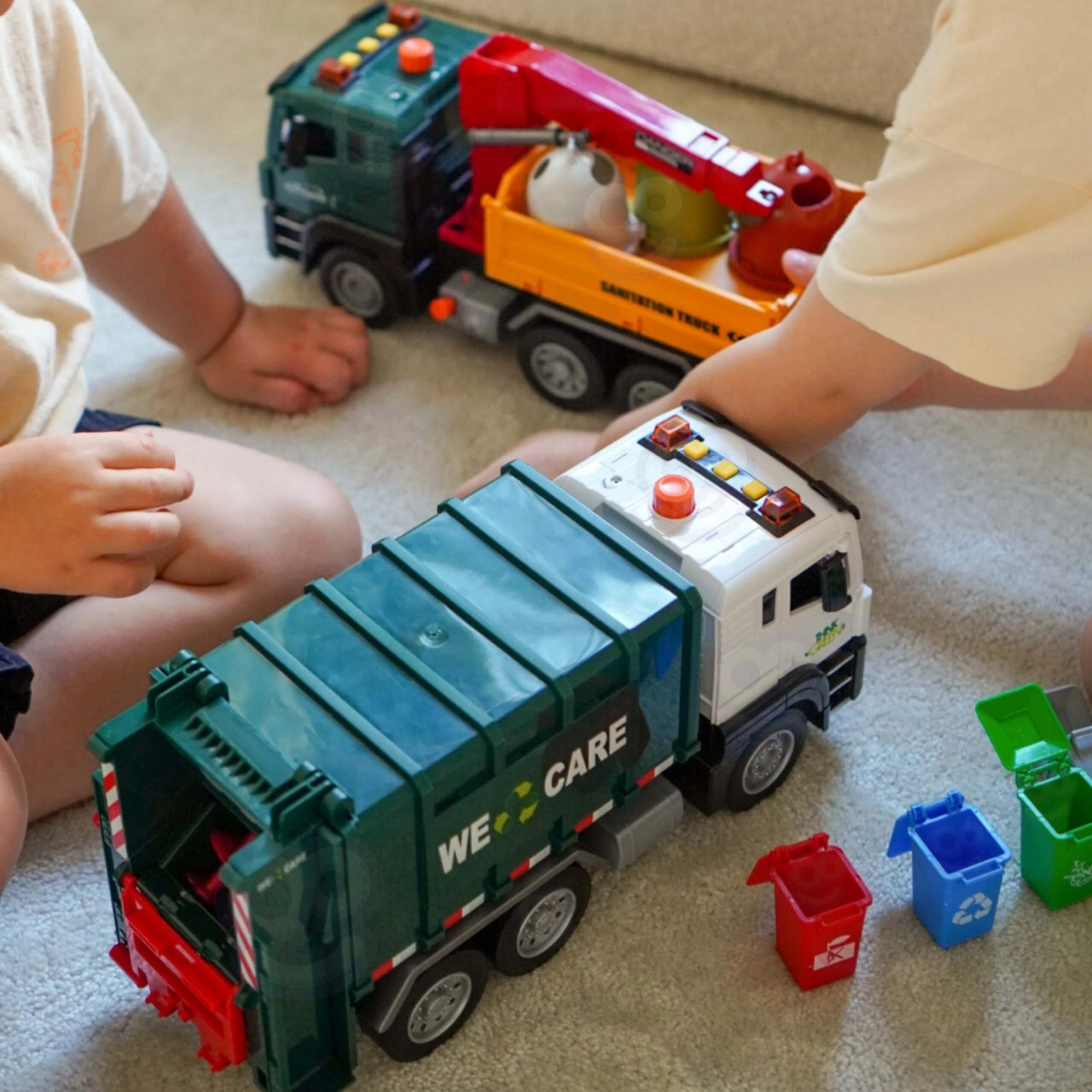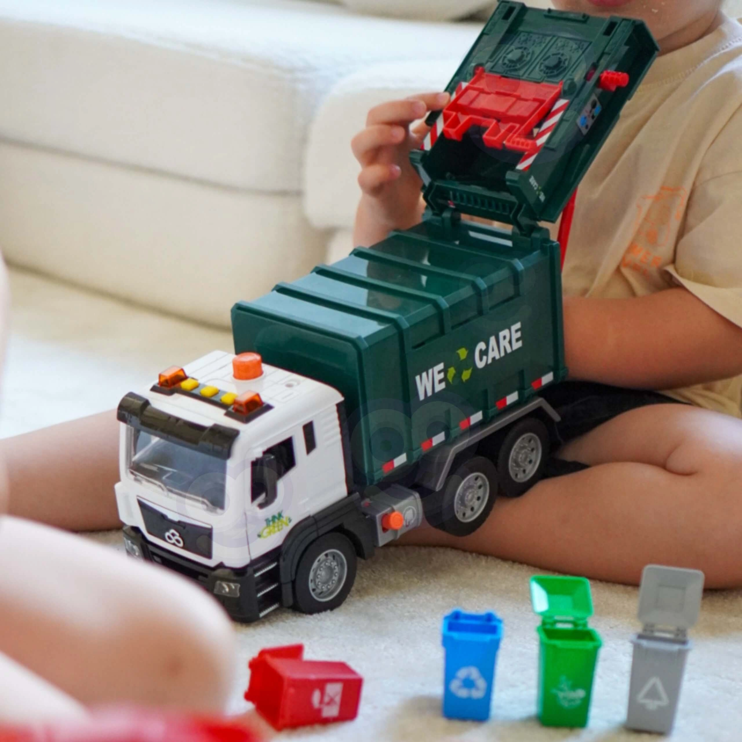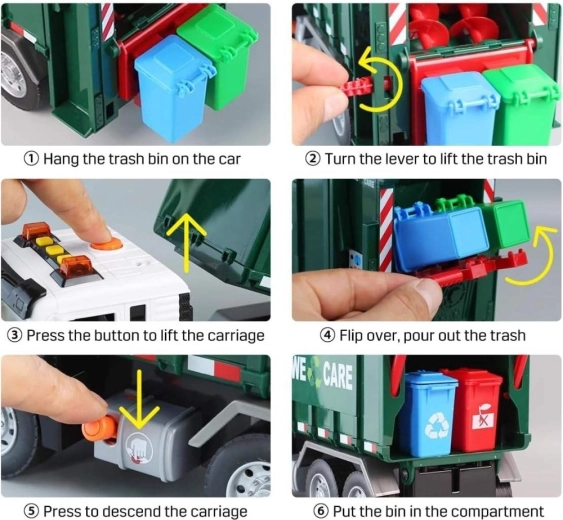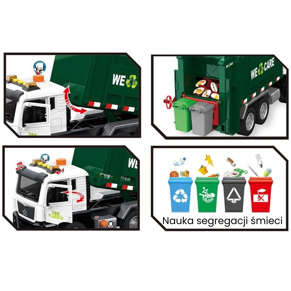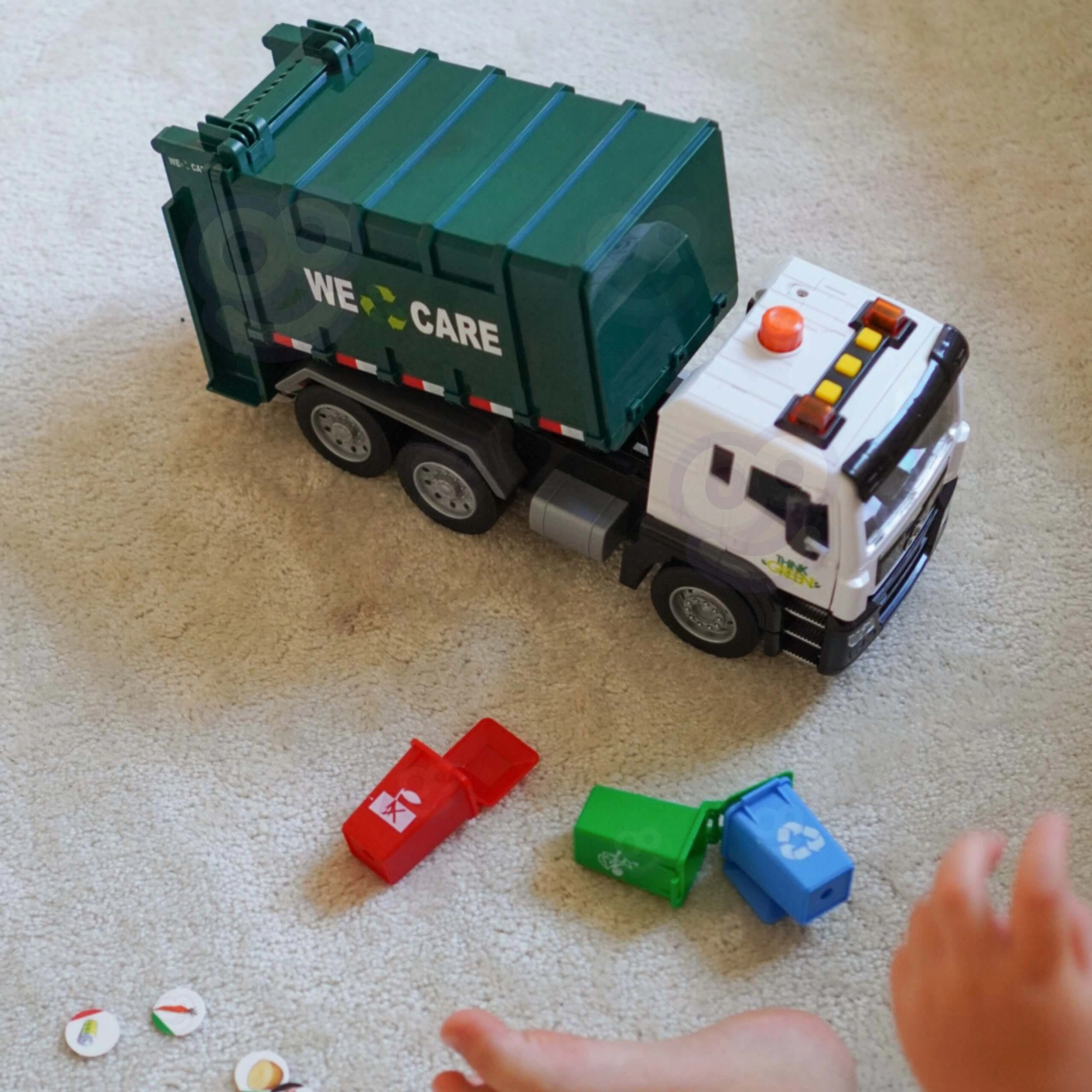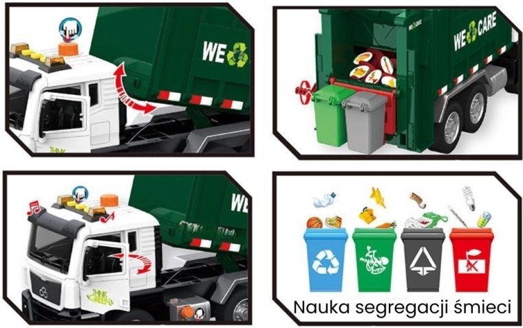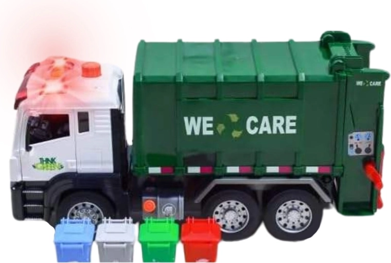 De wagen is uitgerust met licht en geluid voor nog meer betrokkenheid. In de verpakking vind je 4 gekleurde bakken en een set kaartjes met afvalsoorten die kinderen helpen begrijpen wat waar thuishoort. Geschikt voor dagelijks spelen thuis en in de kleuterklas.