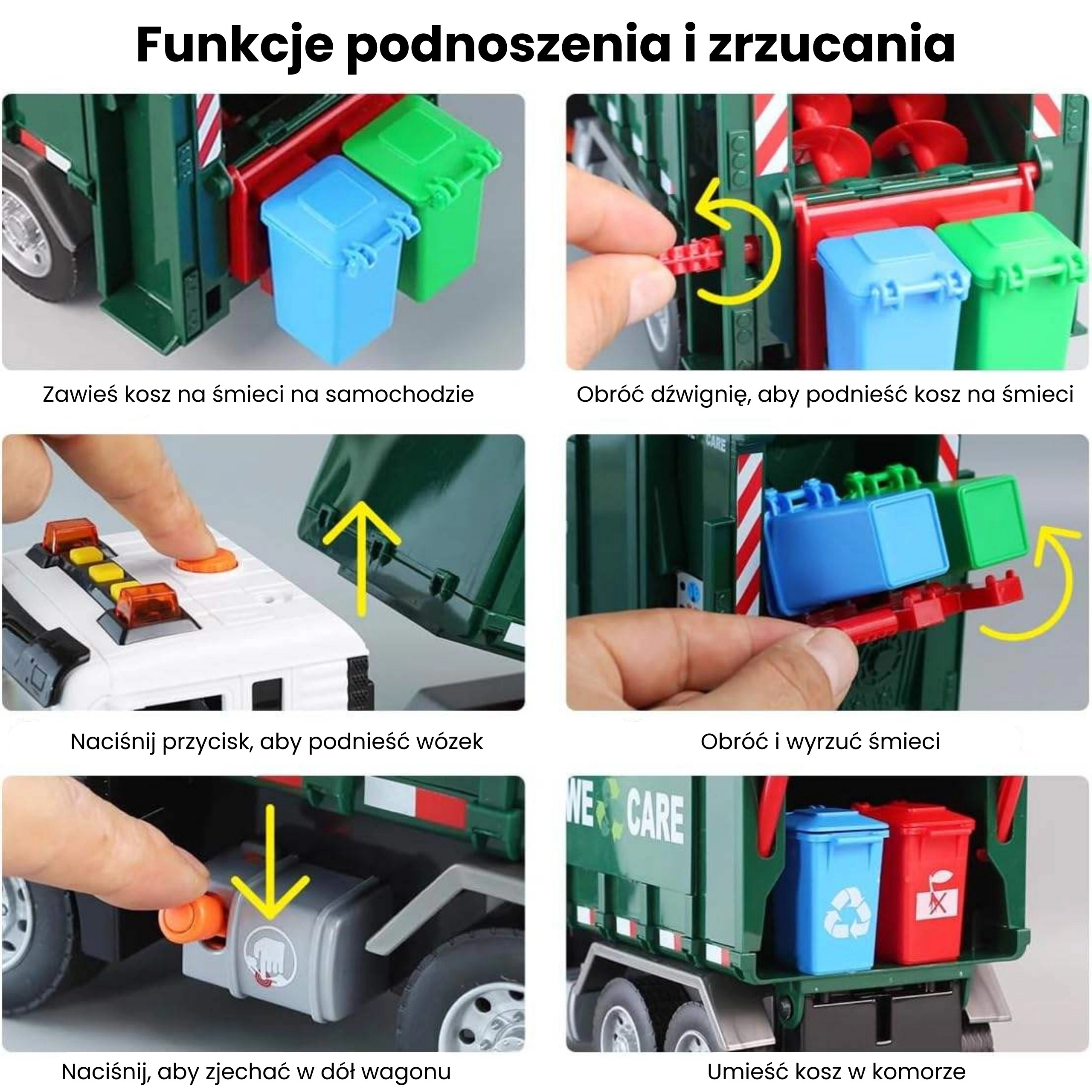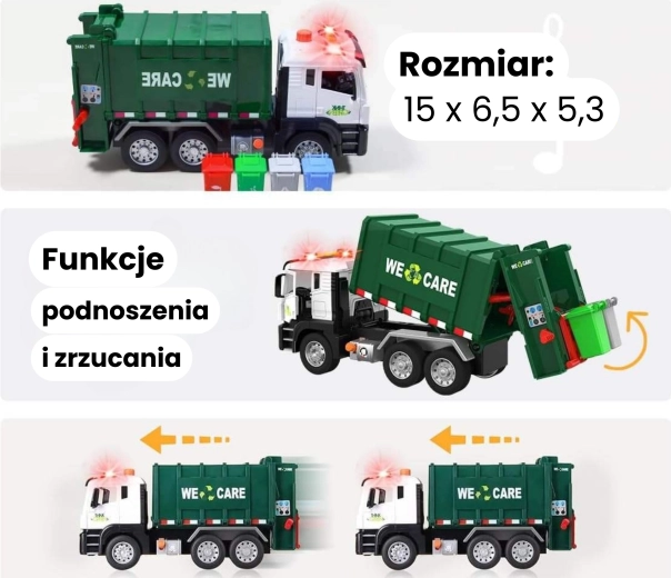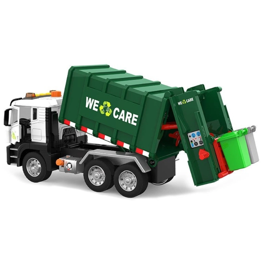 Deze gedetailleerd uitgewerkte vuilniswagen met de opdruk “We Care” biedt kinderen een authentieke ervaring van stadsverkeer. De functionele arm voor het heffen van bakken, de openende achterlaadruimte en de robuuste constructie ondersteunen realistisch spel en het aanleren van milieuvriendelijke gewoonten.