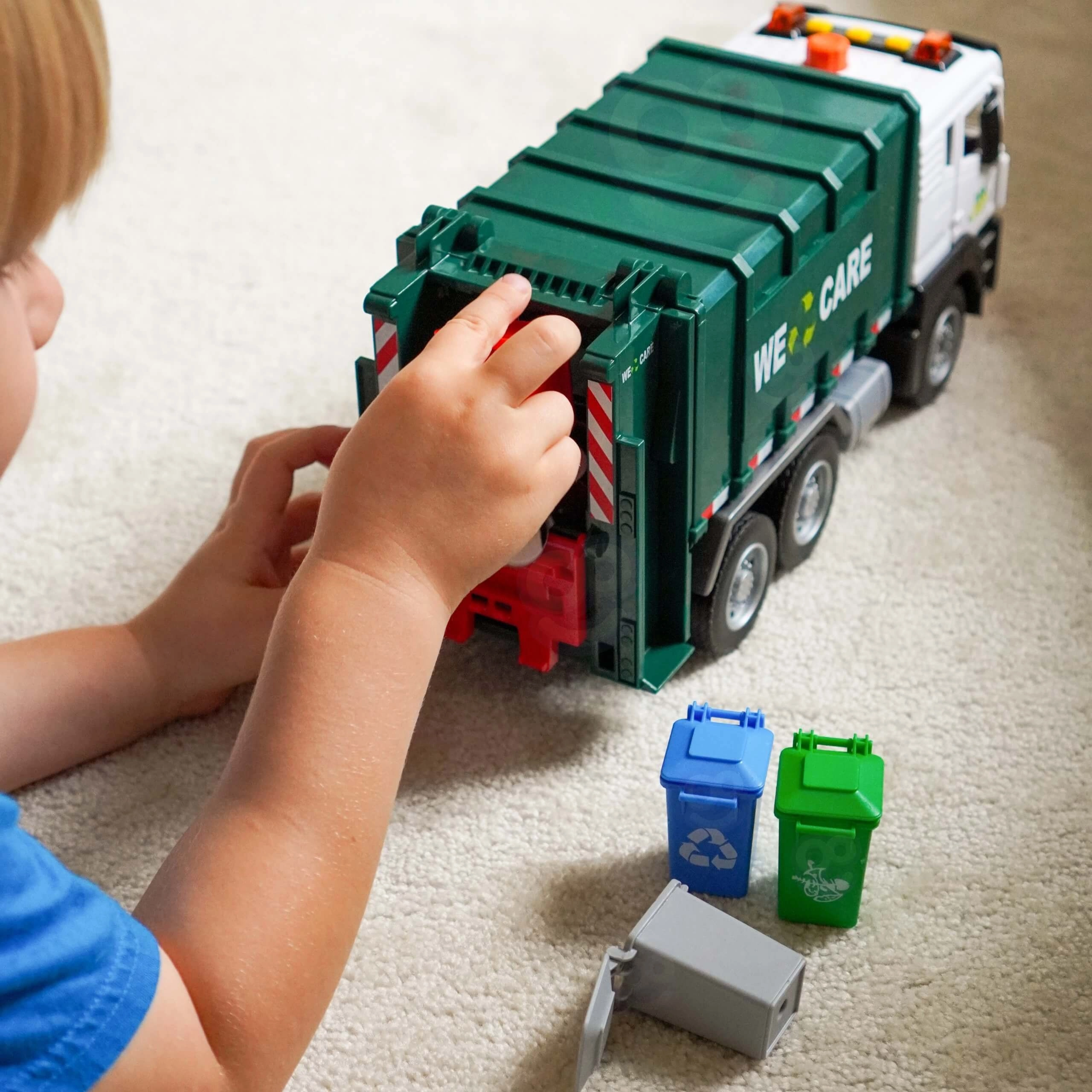 Het zij- en achterlaadmechanisme tilt kleine bakken op en leegt de inhoud in de container – precies zoals bij een echte inzameling.