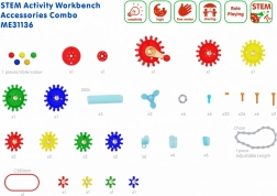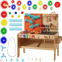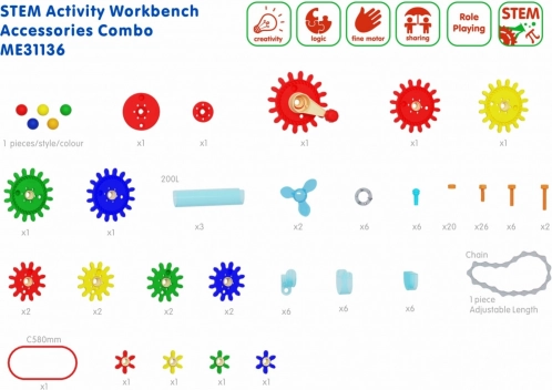 De set bevat een uitgebreide collectie tandwielen, een ketting met verstelbare lengte, een riem voor bewegende constructies, katrollen, schroeven, moeren en gereedschap waaronder een boor, schroevendraaier, zaag en hamer. Dankzij de compatibiliteit met andere MASTERKIDZ STEM-accessoires kan het werkstation eenvoudig worden uitgebreid.