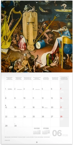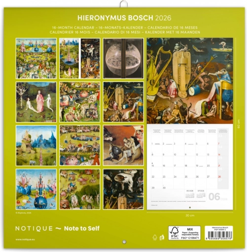 Notitiekalender Jheronimus Bosch 2026 - surrealistische schilderijen en ruimte voor notities. Overzichtelijk calendarium in meerdere talen.