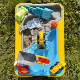 Draaibare kraan, afritten, waterrad en ramps trekken kinderen het spel in. Giet water, laat de stroom lopen en vervoer materiaal met de mini-voertuigen.