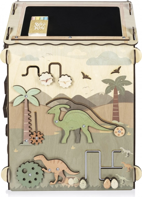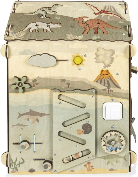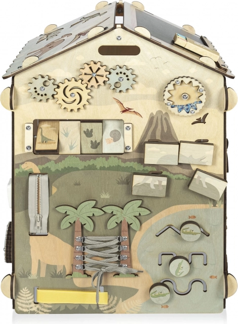 Dit stabiele en mooi geïllustreerde huisje (ca. 61 × 40 cm) is ontworpen als een interactieve speelruimte waar kinderen principes van oorzaak en gevolg ontdekken, oog-handcoördinatie trainen en hun verbeelding ontwikkelen. Het dinothema prikkelt natuurlijke nieuwsgierigheid en maakt van leren een spel.
