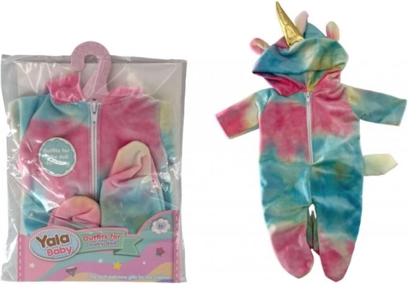 Prachtige eenhoorn-onesie voor poppen met een grootte van 40 tot 43 cm. Deze modieuze accessoire biedt regenboogkleuren en een gouden hoorn, wat zorgt voor stijlvolle speelpret voor alle kleine prinsesjes.