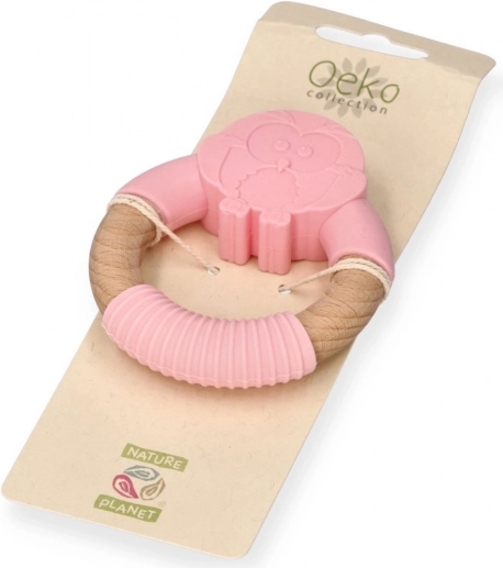 Roze siliconen bijtring Nature Planet in de vorm van een uiltje. Zacht, licht, eenvoudig afwasbaar, geschikt vanaf 0m+. Afmetingen 7 × 8,5 cm. CE-conform.