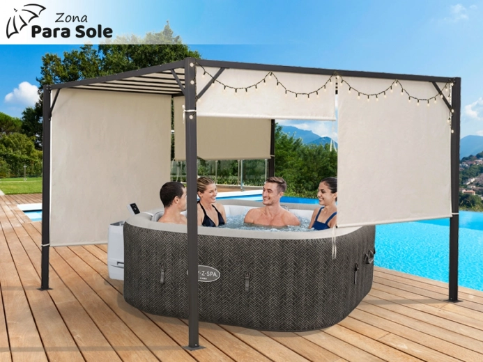 Pergola Para Sole Zona is de perfecte aanvulling voor uw tuin het hele jaar door. Dankzij de waterdichte overkapping en verstelbare screens biedt hij comfort en stijl bij elk weertype.