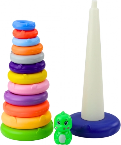 Deze speelgoedset bestaat uit een stevige en stabiele basis, een hoge pin en 13 kleurrijke ringen in verschillende maten. Alle onderdelen zijn gemaakt van licht en duurzaam plastic dat veilig is voor kleine kinderen. De bovenkant van de toren is versierd met een figuurtje van een lieve dinosaurus, dat de aandacht van kinderen trekt en aanzet tot verder spel.