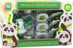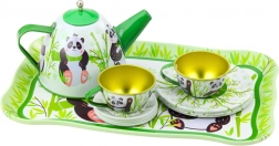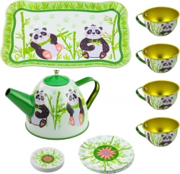 De kinder metalen theeset met pandamotief is ideaal voor kleine liefhebbers van theekransjes. In de verpakking vindt u een theepot, vier kopjes, schoteltjes en bordjes. Elk element is versierd met vrolijke afbeeldingen van panda's en bamboe in groen-witte kleuren, wat kinderen een leuke en kleurrijke speelervaring biedt.