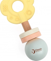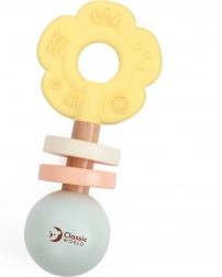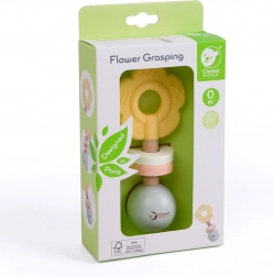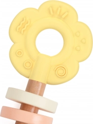 Schattige rammelaar in de vorm van een bloem, ontworpen voor de allerkleinsten, met zachte pasteltinten die de aandacht van het kind trekken. Gemaakt van veilige materialen, hout en siliconen, geschikt vanaf de geboorte.