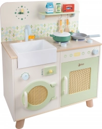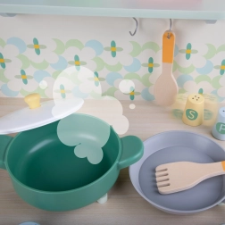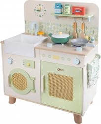 Deze houten keuken is ontworpen voor kinderen vanaf 3 jaar en biedt prachtige esthetische details in pastelkleuren. Hij bevordert de verbeelding, motoriek en sociale vaardigheden van kinderen. De keuken is met hoge kwaliteit en aandacht voor elk detail vervaardigd. In de set zitten ook keukenaccessoires die kinderen kunnen gebruiken voor rollenspellen rond koken en alledaagse situaties.