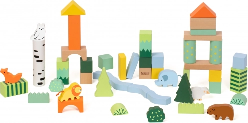 Houten blokken met bosmotief van Classic World vormen een creatieve set die kinderen meeneemt naar een wereld vol bosavonturen. De verschillende vormen en kleuren maken vrij bouwen mogelijk en stimuleren de verbeelding en creativiteit van kinderen.