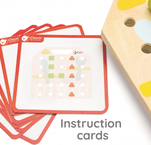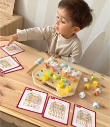 Kinderen kunnen verschillende vormen maken met behulp van bouten op het houten bord, wat niet alleen heel leuk is maar ook bevorderlijk voor hun groei. Het verbetert de coördinatie, concentratie en de kracht van polsen en handen. Voorbeeldkaarten bieden allerlei uitdagingen die kinderen kunnen uitproberen; samen met ouders kunnen ze patronen uit het hoofd bouwen. Deze activiteit draagt ook bij aan het herkennen van kleuren en vormen.