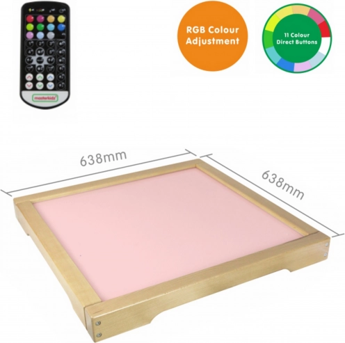 Het LED-lichtpaneel van MASTERKIDZ is een stevige, houten doos met LED-achtergrondverlichting die kan worden aangepast met een afstandsbediening. De gebruiker kan het paneel instellen op een van de 11 vooraf ingestelde kleuren of het licht handmatig aanpassen door de basiskleuren rood, groen en blauw te combineren.