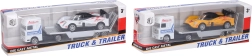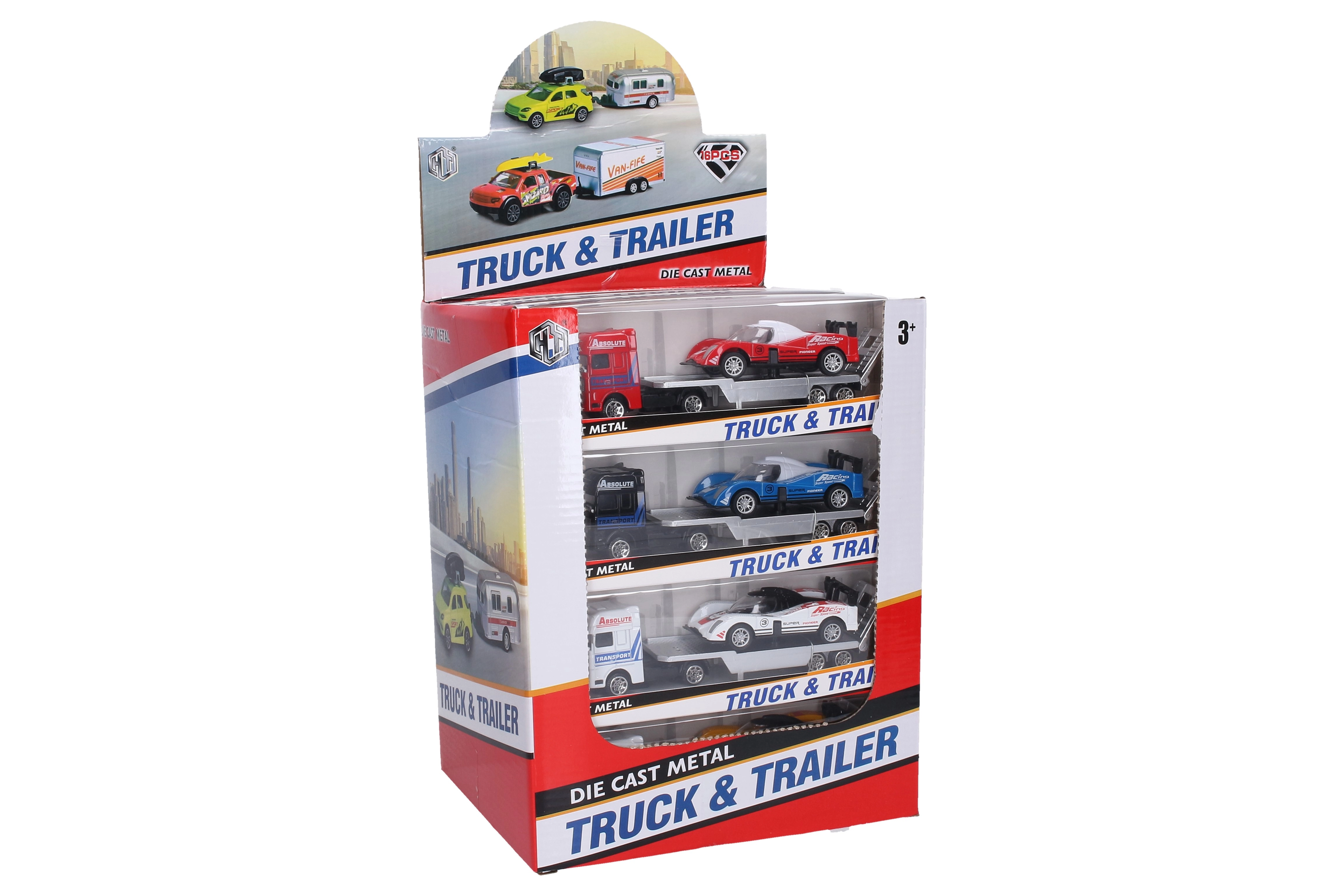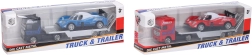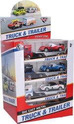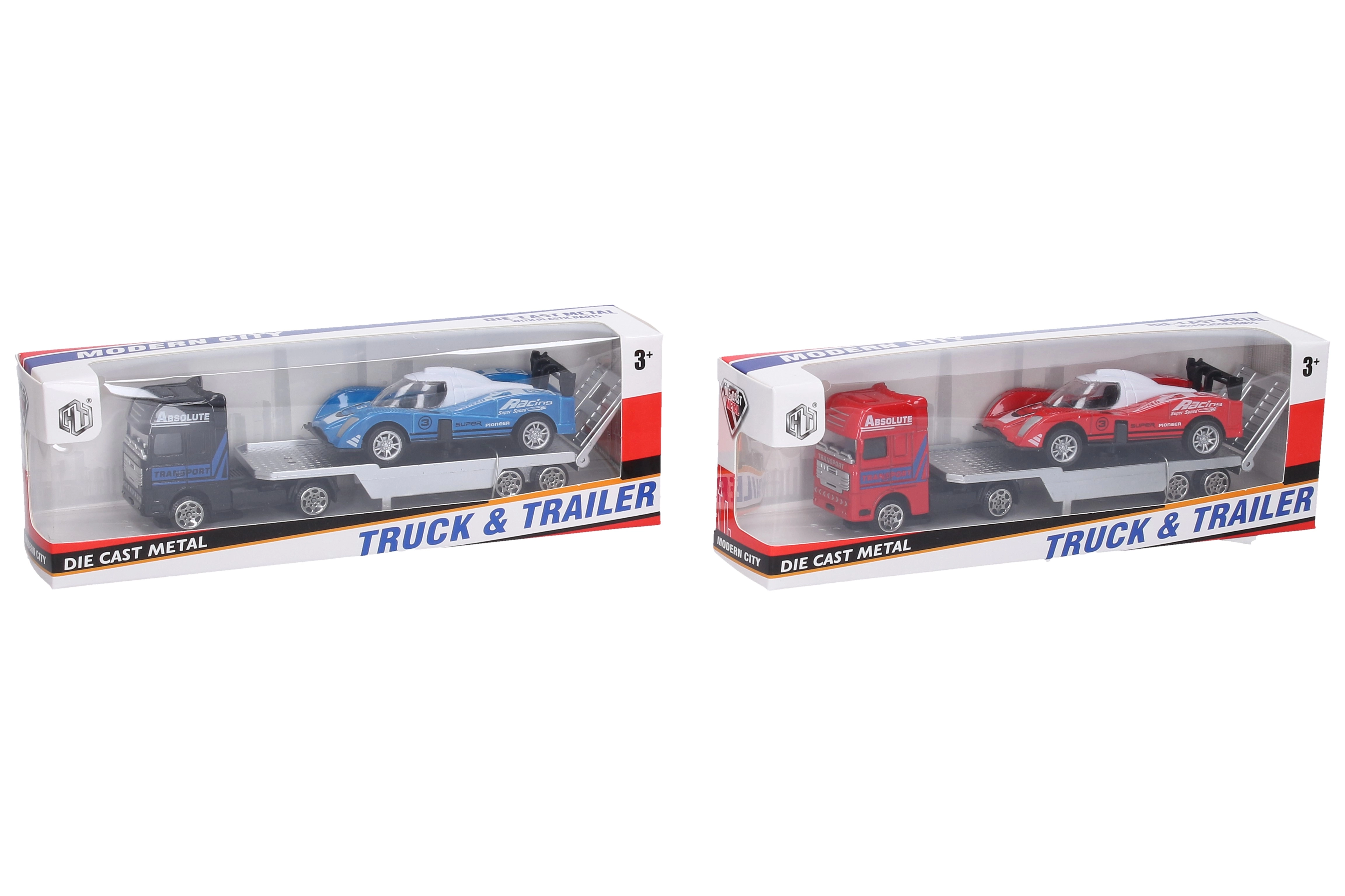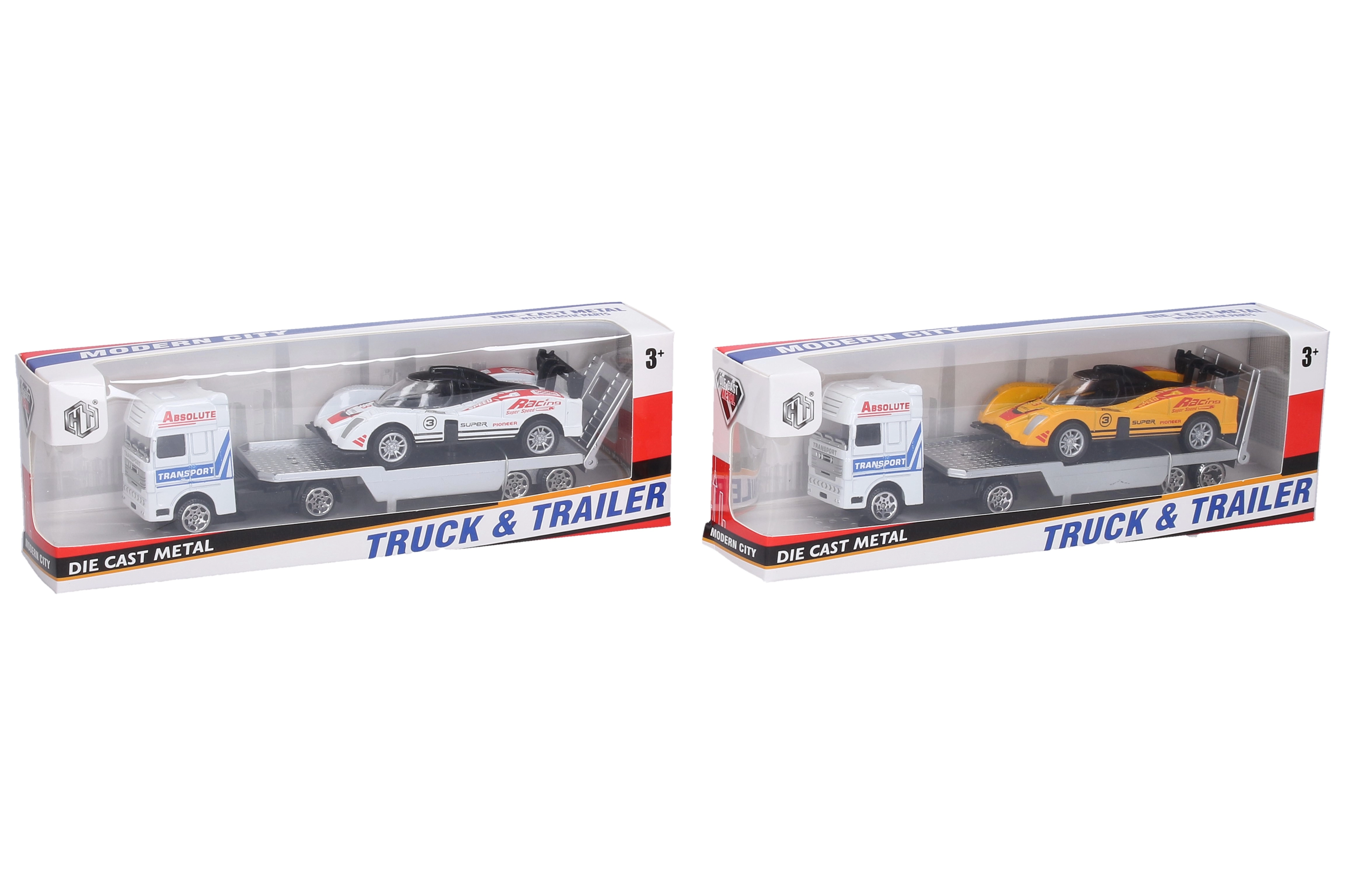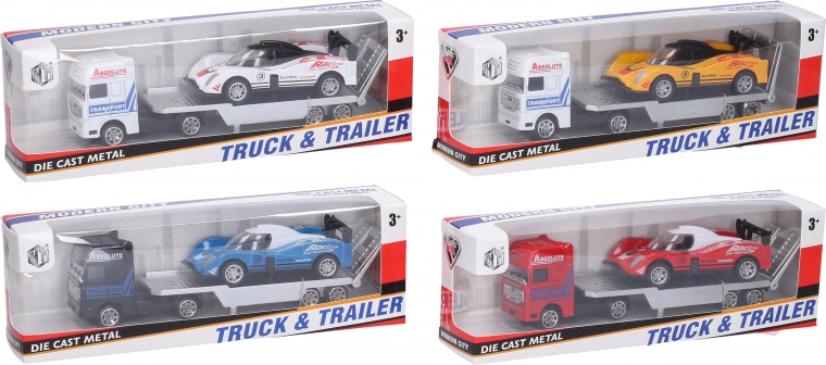 Vrachtwagen trekker met raceauto is een uitstekende keuze voor liefhebbers van autoraces. Deze metalen auto met vrijlopende wielen en compacte afmetingen brengt elke kinderspel tot leven.