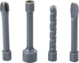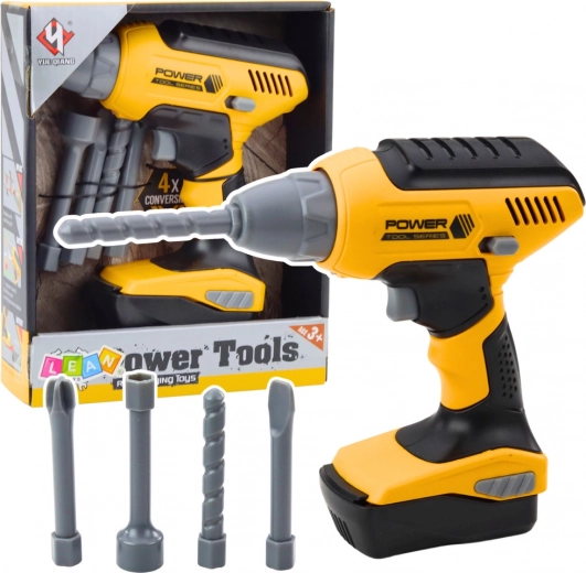 De set bevat 4 verwisselbare bits: boor, platte schroevendraaier, kruiskopschroevendraaier en sleutel. Kinderen kunnen het gereedschap aanpassen aan hun ‘reparaties’.