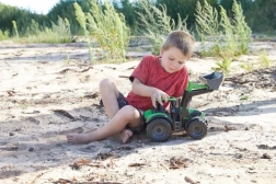 De aanhanger met kiepfunctie maakt snel lossen van het vervoerde materiaal mogelijk en vergroot de speelmogelijkheden.
