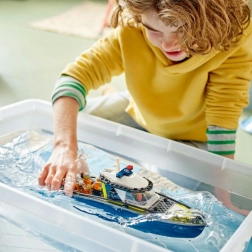 Bouw een gedetailleerde politieboot met twee buitenboordmotoren, een cockpit en een cel aan boord en ga op missie. Kinderen kunnen beide boten echt op het water zetten en realistisch spelen – van het gebruiken van handboeien en de inzet van de reddingsboei tot een dramatische achtervolging met een haai.
