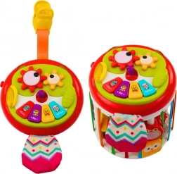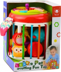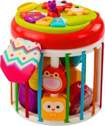 Op de bovenkant van de kubus bevindt zich een muziekpaneel met knoppen die geluiden en diereniconen afspelen. Deze geluiden trekken direct de aandacht van het kind en helpen het oorzaak en gevolg te begrijpen. Andere interessante elementen zijn onder meer kleurrijke tandwielen om mee te spelen, een spiegeltje en een zachte opening voor het inwerpen van blokjes.