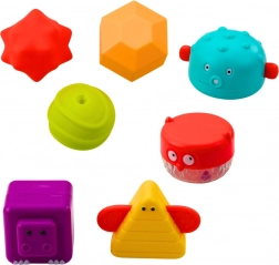 Het speelgoed bevat 7 uiteenlopende blokjes met afmetingen van ongeveer 4–6 cm, die verschillende uitsteeksels, texturen of dierengrafieken hebben. Elk blokje heeft een andere vorm en kleur, wat het visuele en cognitieve waarnemen ondersteunt.