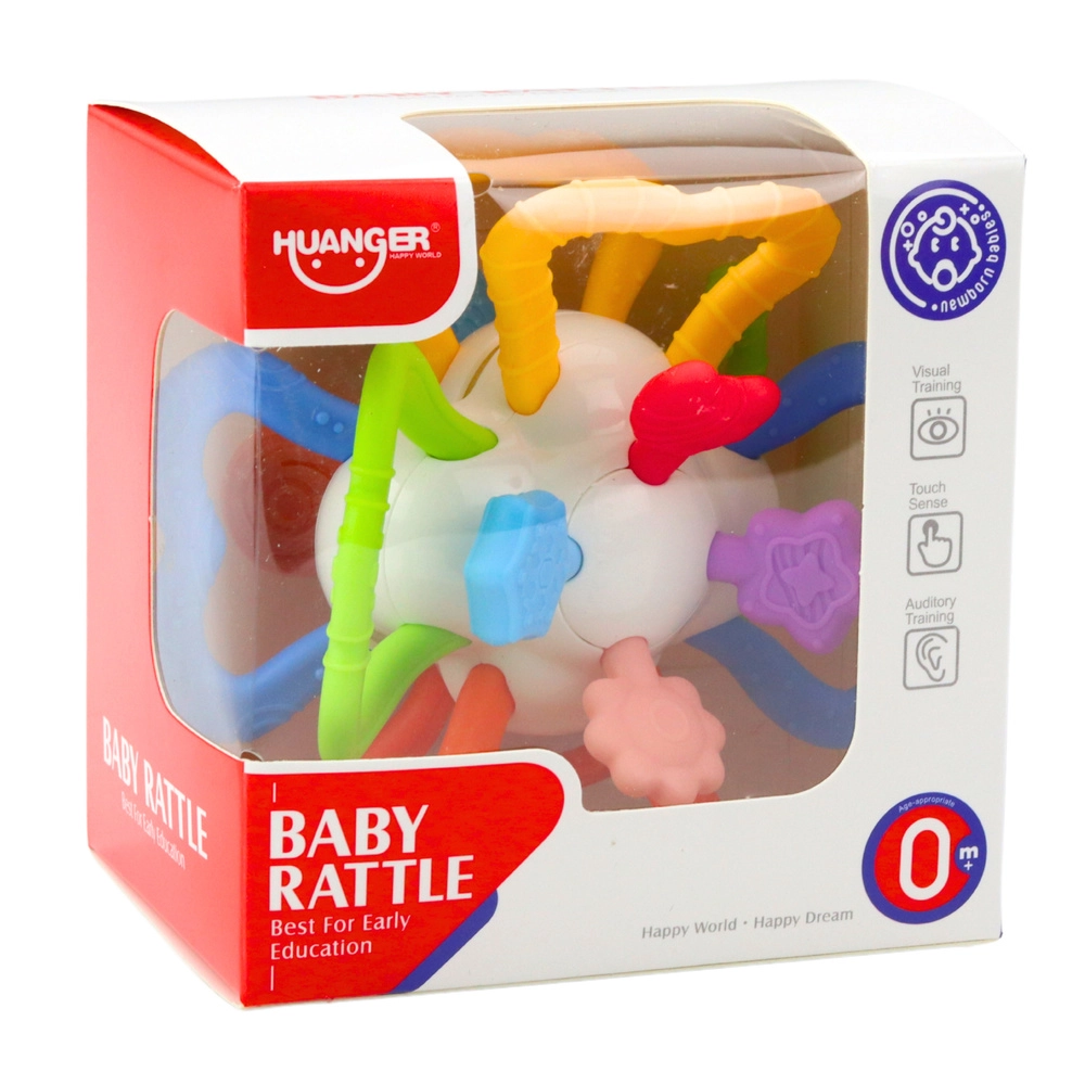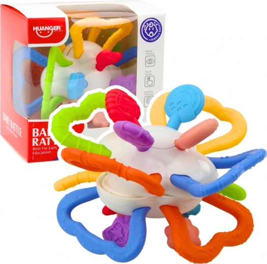 Dit speeltje bestaat uit twee beweegbare, draaibare centrale delen die het kind kan bewegen, wat helpt bij het trainen van de grijpreflex en de hand-oogcoördinatie ontwikkelt. Daarnaast is het hele speeltje omgeven door kleurrijke, flexibele grepen met verschillende vormen en texturen, gemaakt van veilig, zacht materiaal dat op rubber lijkt. Deze elementen zijn ideaal om op te bijten en bieden verlichting tijdens het doorkomen van tandjes.
