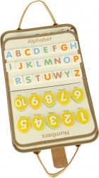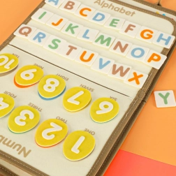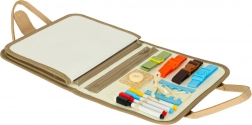 Educatieve mogelijkheden: Binnenin de koffer vind je viltsnippets om te naaien, educatieve kaarten met letters en cijfers, en een whiteboard voor creatieve activiteiten.