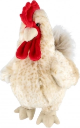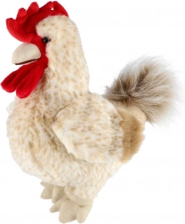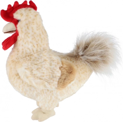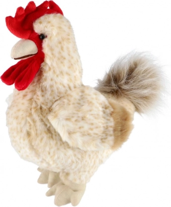 De realistische afwerking met rode kam, zachte vleugels en een pluizige staart stimuleert de fantasie en zintuiglijke beleving. Het stabiele lijfje en de zachte pootjes maken het eenvoudig om het speeltje op een plank of tafeltje neer te zetten.