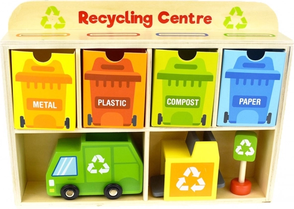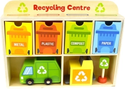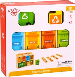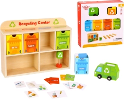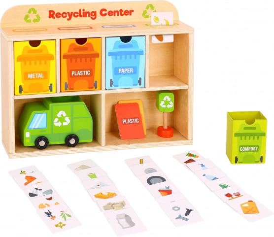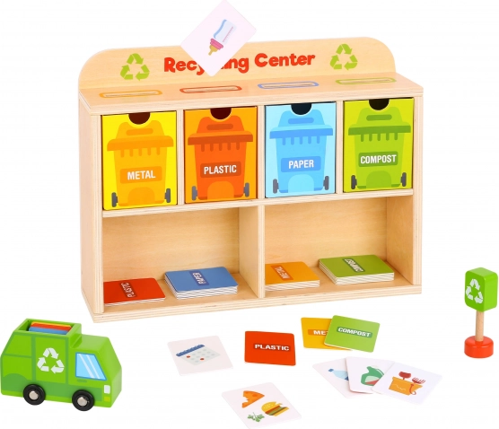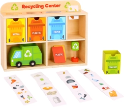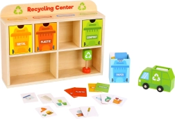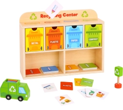 Met het Recyclagecentrum van Tooky Toy leren kinderen hoe ze afval op de juiste manier moeten scheiden. Elke kaart toont afval van verschillende materialen dat kinderen eerst in de vuilniswagen plaatsen, vervolgens in de sorteringsmachine, en tenslotte in de juiste container die in de houten kast is geplaatst.