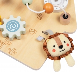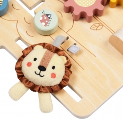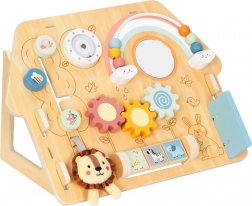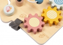 Tandwielen, schuivers, een regenboogboog met kralen, een spiegeltje en een draaibare roller houden de aandacht vast en ontwikkelen fijne motoriek en coördinatie.